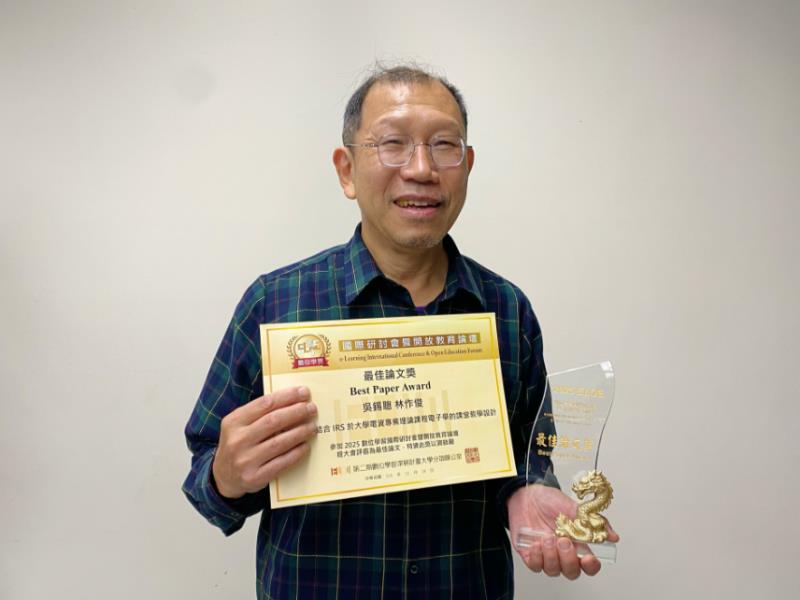 除了學生表現亮眼,本校教師與行政團隊亦在本次研討會中獲得多項肯定。黃朝曦老師榮獲「全國磨課師教育貢獻獎」,肯定其長期投入磨課師課程發展與教育推廣的貢獻;吳錫聰老師與林作俊老師則以研究成果獲頒「最佳論文獎」,展現本校在數位教學與學習研究上的深厚實力。行政團隊方面,數位學習資源中心同仁黃冬青獲頒「傑出行政獎」、吳玉茹獲得「交流會全勤獎」,反映大會對宜大行政支援、計畫執行與跨校協調能力的高度肯定。