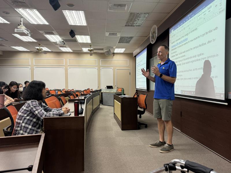 該校國際處舉辦「國際事務專業英語溝通工作坊」,以強化職員在英語溝通的能力,特別邀請具多年教學經驗之外籍講師Adam Chiappetti 蒞校授課,課程內容聚焦於國際學生接待、校園日常協助、跨文化互動及校園活動英語應用等實務情境,並透過情境模擬與互動練習,引導教職員於實際工作場域中,自然且自信地運用英語進行溝通,提升專業表現。