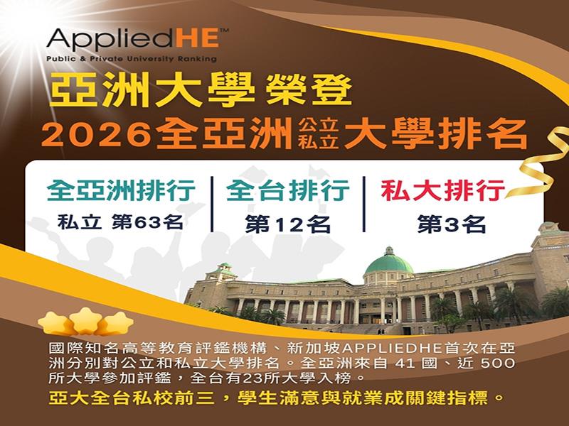 亞洲大學(Asia University, Taiwan)於最新公布的「2026 AppliedHE 全亞洲公立與私立大學排名」(AppliedHE All Asia Public & Private University Rankings 2026)中,於全亞洲私立大學榜單名列第63名,顯示亞洲大學在研究表現、國際化程度、學生學習體驗與就業成果等面向,已逐步累積具體且可被國際評鑑體系辨識的學術能量與社會影響力,這是首次在亞洲分別對公立和私立大學進行評估的大學排名,且將學生反饋和就業成果置於其評估方法的核心位置。