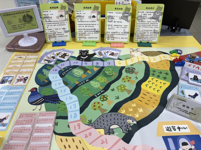 另一件獲獎作品「山林生態探險日」則以桌遊形式,帶領幼兒走進台灣山林生態。遊戲結合顏色辨識、動物棲地高度與生態特性,讓幼兒在翻牌與互動過程中,學習台灣黑熊、帝雉、穿山甲、石虎等瀕危動物的生活環境與保育觀念。