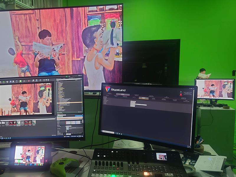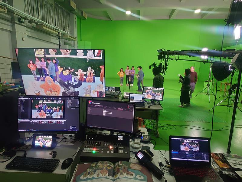 此次產學合作由嶺東科大數媒系吳崇榮老師與數媒系周玄祥老師領軍,對嶺東數媒的學生而言,是一場「玩真的」實戰演練。計畫主持人吳崇榮老師憑藉其豐富的節目動畫製作經驗,帶領嶺東科大「動畫研習社」的學生,針對不同繪本主題,進行2D與3D的動畫資產製作。而協同主持人周玄祥老師親自帶領「虛擬製作研習社」的同學,從旁觀摩並實際操作虛擬棚的拍攝流程,學習如何將動畫師製作的場景,與現場的人物影像即時合成。