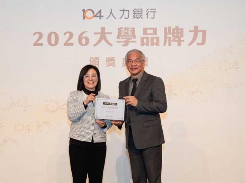 世新大學在2026年《大學品牌力》調查中,連續三年榮獲「大眾傳播學群」全國第一殊榮,104資訊科技總經理黃于純(左)頒獎予校長陳清河(右)