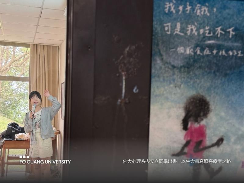 佛光大學心理學系學生岑安立(筆名小艾),近日出版作品《我好餓,可是我吃不下》,近日舉辦新書發表會。此書以平實卻深刻的文字記錄她與厭食症共處、抗衡的歷程,展現從身體受困到心靈蛻變的生命力。系主任周蔚倫與系上多位教師親臨現場支持新書發表會,並設計「有話要說」活動,邀請參與者透過便條紙書寫對作者或自身的鼓勵話語,現場亦舉辦贈書抽獎,氣氛溫馨而感性。