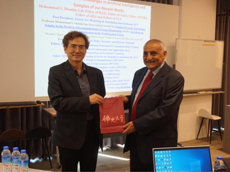 佛光大學應用科技與設計學院為強化研究能量與拓展國際視野,舉辦國際學者交流活動,特別邀請兩位享譽國際的頂尖學者—IEEE 終身會士 Mohammad S. Obaidat 教授,以及巴基斯坦學者 Dr. Sana Ullah 蒞臨演講。兩位學者聚焦人工智慧(AI)與無線通訊等全球科技發展的關鍵議題,為全校師生帶來深具前瞻性的知識交流與研究啟發。