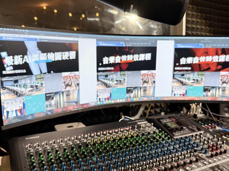 嶺東科大數媒系設置兩間專業錄音室,空間規劃與聲學設計全面比照業界製作現場,可支援動畫配音、影像後期、音樂製作、旁白錄製與擬音(Foley)創作等多元應用。設備配置涵蓋 49 吋 Odyssey OLED G9 曲面顯示器、Yamaha 專業混音機、Focusrite 8 軌麥克風前級與 Behringer 真空管前級,並導入 SHURE、SONY、RODE、Neumann 等國際專業品牌,讓學生從學習階段即熟悉真正進入產業所需的設備與工作流程。