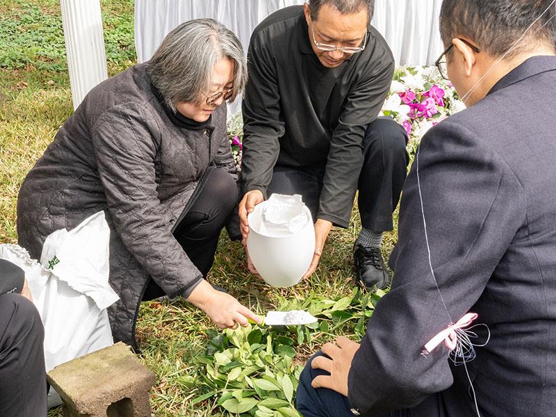 南華大學生命禮儀研究中心舉辦「自然葬儀式的創新與展演」活動,展演團隊模擬處理骨灰入土。