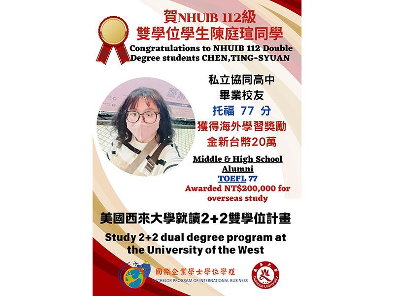 南華大學深化國際化資源,國企學程學生陳庭瑄赴美展開雙學位學習。