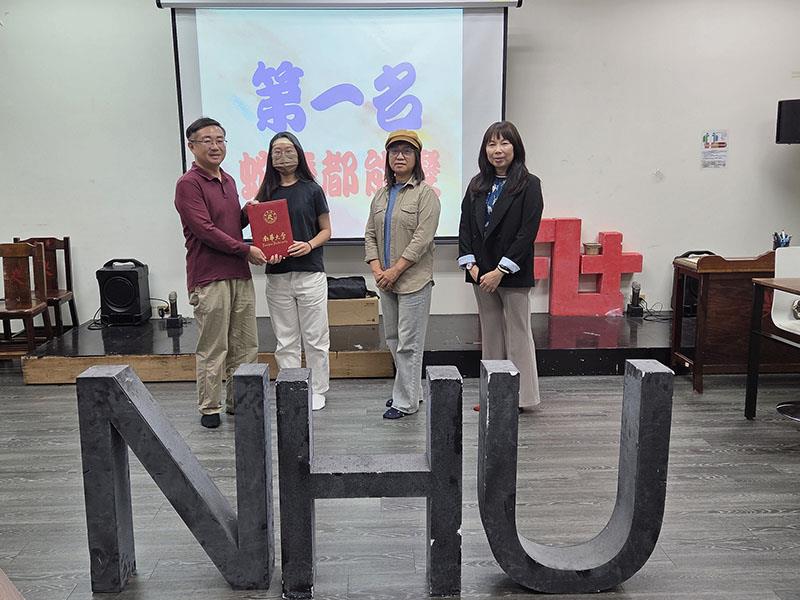 南華大學通識教育中心舉辦學生專題feat.黑客松競賽,通識中心主任林俊宏(左1)、王緯甄(右1)、孫家榕(右2)評審委員共同頒獎給榮獲第一名的團隊。
