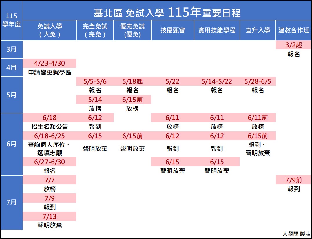 3.基隆市:報名是5月18日至6月5日,放榜是6月12日。
