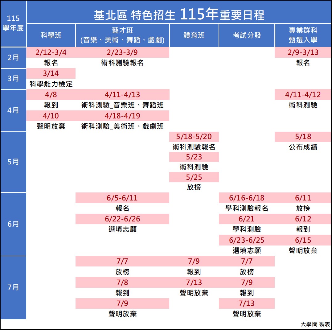 想參加115基北區特色招生的考生請留意,包括「科學班」、音樂、美術、舞蹈、戲劇等「藝才班」、「專業群科甄選入學」等都是在2、3月陸續開始報名,「體育班」則是5月開始報名;藝才班和專業群科的術科測驗都在4月,體育班術科測驗則是在5月舉辦。「考試分發」則為最晚,於6月報名考試。現將115基北區特色招生重要的升學日程整理如下,請勿忘記。