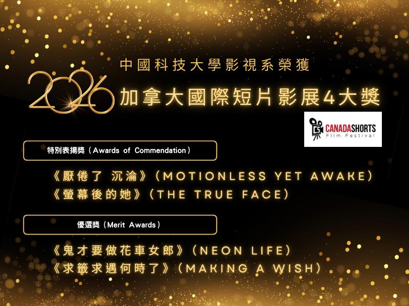 2026年自加拿大傳來捷報,年度國際級影展盛事之加拿大國際短片影展(Canada Shorts - International Short Film Festival)中,中國科技大學影視設計系師生展現豐沛創作能量,共有4部作品在激烈的國際競爭中脫穎而出,分別榮獲「特別表揚獎(Awards of Commendation)」與「優選獎(Merit Awards)」,再度向國際展現台灣影視教育的實力與獨特的敘事觀點。 加拿大國際短片影展(Canada Shorts)是以加拿大與國際電影人為核心的知名競賽平台,旨在發掘與表彰全球優秀的短片創作。該影展評選標準嚴謹,不僅重視影像技術的純熟度,更看重創作者在有限篇幅內傳達故事張力與情感深度的能力。中國科大影視系學生能一舉囊括四項大獎實屬難能可貴,完全展現學生從自我對話到文化反思多元題材的創作深度。 榮獲特別表揚獎(Awards of Commendation)的兩部作品,展現了創作者對人性與社會現象的細膩觀察。由新竹校區艾畢爾同學所導演之作品《厭倦了 沉淪》(Motionless Yet Awake),透過獨特的影像美學,探討在停滯與覺醒之間的心理狀態,不僅片名富含哲理,其視覺語言更獲得評審高度讚賞。另一部由洪聖勤執導的《螢幕後的她》(The true face),則將鏡頭對準台灣av產業,揭開螢幕形象與真實自我之間的落差,敘事手法流暢且發人深省。 榮獲「優選獎(Merit Awards)」的兩部作品同樣表現不俗,《鬼才要做花車女郎》(Neon Life),將台灣特有的文化符號與現代生活情境結合,以強烈的色彩風格呈現出獨特的生命力與角色掙扎;而由王昭旺系主任擔任指導老師的畢製作品《求籤求遇何時了》(Making a wish),則講述原事業有成的上班族遭陷害資遣後,意外在神祕廟宇開啟平行世界的經歷。將傳統信仰的「求籤」儀式作為敘事核心,在祈願與等待之間,細膩刻畫出人物對於未來的迷惘與期盼,展現了濃厚的在地文化底蘊。 影視設計系近年來積極推動「以賽代訓」的教學策略,鼓勵師生將課堂所學轉化為實際創作,並勇於挑戰國際舞台。王昭旺系主任表示,透過參與國際影展,學生不僅能與全球創作者進行作品對話,更能提升宏觀的國際視野。 此次在加拿大國際短片影展的優異表現,再次印證了中國科技大學影視設計系在劇本創作、導演實務、美學設計及後製技術上的扎實訓練。未來,該系將持續挹注資源,支持更多師生作品進軍國際,讓台灣的故事與創意在世界各地的銀幕上綻放光芒。落實影視專業與國際接軌,培育新世代影視人才的教育目標。