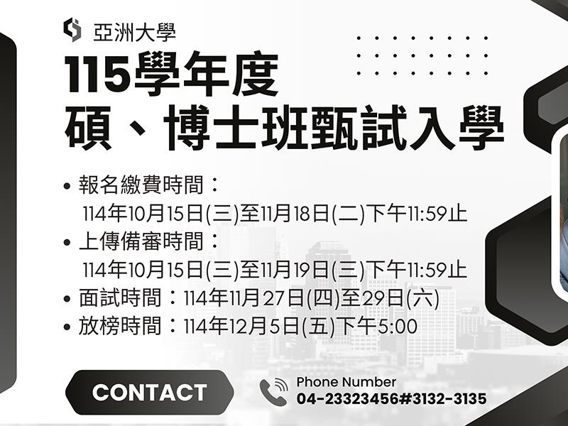 大學校園 亞洲大學115學年度碩、博士班甄試入學,報名開跑!