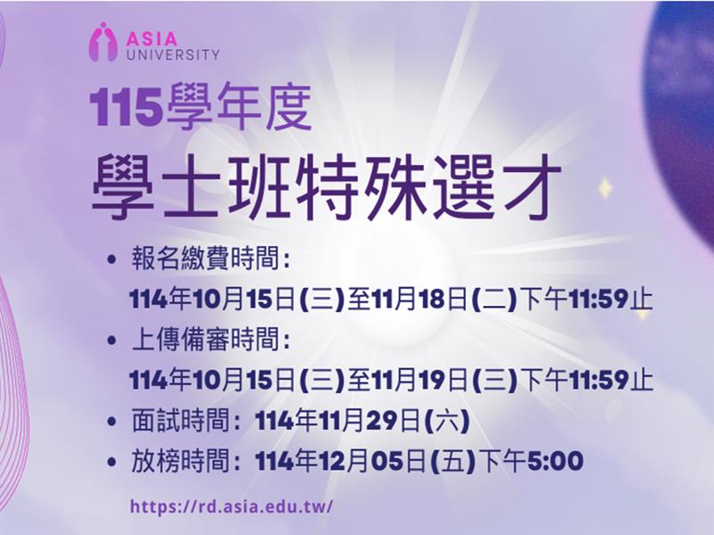 亞洲大學115學年度學士班特殊選材,報名開跑! 報名/繳費時間:114.10.15(三)-11.18(二)下午11:59分止 面試時間:114.11.29(六)* 放榜時間:114.12.05(五)下午5:00