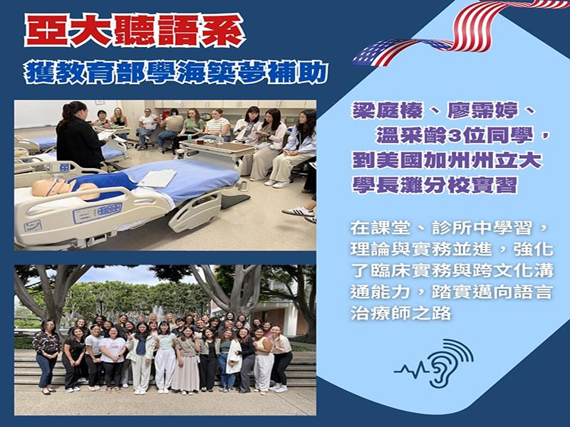 亞洲大學聽語系3位同學,獲教育部學海築夢補助,今年暑假到美國加州州立大學長灘分校實習1個月。
