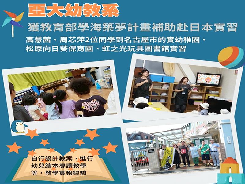 亞洲大學幼教系學生獲教育部「學海築夢計畫」補助,讓同學走向國際,赴日本名古屋實習一個月。 亞大幼教系學生在日本實習期間,透過幼稚園與保育園進行繪本導讀、教案設計,實戰中累積滿滿教學力,不僅學以致用更跨國學習提升國際視野,讓自己的夢想變得更靠近!
