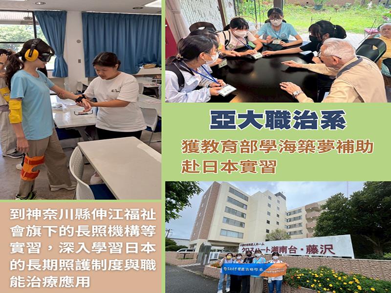 亞洲大學職能治療系5位同學,獲教育部學海築夢計畫補助,前往日本神奈川縣伸江福祉會,在該會旗下的長照機構等實習,深入學習日本的長期照護制度與職能治療應用,也在實務操作、活動設計與照護技巧上獲得全方位的成長。