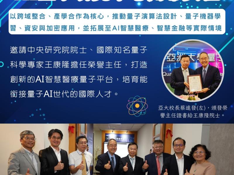亞洲大學「量子AI研究中心」(Quantum AI Research Center)10日揭牌,邀請中央研究院院士、國際知名量子科學專家王康隆講座教授擔任榮譽主任。