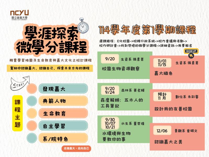 嘉義大學在教育部高等教育深耕計畫A主軸(創新教學精進)規劃下,113年11月27日成立學涯探索教師社群,由教務處彙集20餘位跨院系教師的想法與回饋,逐步凝聚出課程主題與試行方向,並持續透過工作坊、研習與社群教師教學分享,形成「校訂課程-學涯探索微學分課程」,並自114學年度起實施。學涯探索微學分課程以短時數、跨領域與體驗式設計為特色,期望協助大一新生快速熟悉校園、了解系所特色,並逐步培養自主學習的態度與能力。 本學期首波課程已於9月順利完成,包含: ※「森度解鎖:五木人的工具筆記」(森林暨自然資源學系黃名媛老師):透過研究室參訪、植物園與林場導覽,以及學長姐職涯經驗分享,幫助新生認識森林系的學術特色與未來多元發展。 ※「校園生物資源觀察」(生物資源學系張素菁老師):以蘭潭校區為起點,引導學生進行實地生態調查,從植物到動物多樣性,深入認識校園環境與系所專業方向。 這兩門課程不僅成功引導新生深入校園與專業領域,也強化了觀察力、表達力與自主學習的態度,展現嘉大課程多元化的成果。 接下來,本學期將陸續再推出以下4門學涯探索課程: ※水環境與生物要教你的事(水生生物科學系董哲煌老師) ※嘉大織色(生物資源學系張素菁老師) ※設計我的友善校園(數位學習設計與管理學系朱彩馨老師) ※認識嘉大之美(景觀學系曾碩文老師) 這些課程將帶領新生從不同角度探索嘉大,不論是水域生態、校園景觀、人本設計,或是將校園印象化為創作,皆能啟發學生的學習興趣與自我認同。 嘉大教務處表示,「校訂課程-學涯探索微學分課程」不僅讓新生在課堂中獲得學分,更展現教師共同參與教學創新的努力。未來嘉大將持續規劃更多元的課程,讓每位嘉大新生都能在大學起點勇於探索,找到屬於自己的方向與學習熱情。