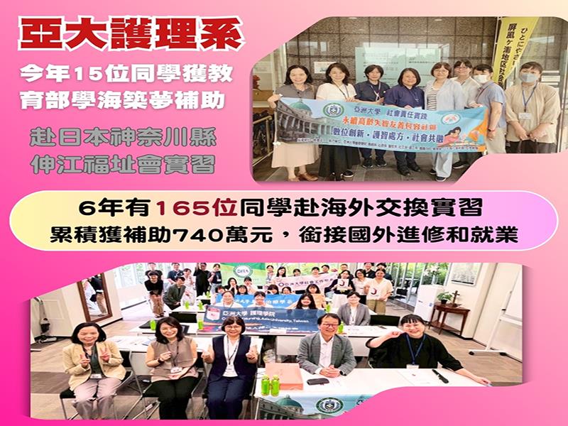 亞洲大學護理系全國首創國際護理學程,培育照顧國際病患、配合國際醫療支援及具跨國移動力之國際護理人才,近6年來已有165位同學,透過學海築夢、新南向、暑期海外交換、國際醫療志工、國際會議等多元管道,赴美、澳、日、韓、新加坡等實習、交換及研修,累積獲教育部、學校補助達740萬元,豐富學生國際視野,進而申請國外研究所升學進修、考取國際護理師執照,銜接海外就業。