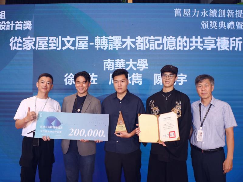 嘉義市政府文化局於9月28日舉辦「114年舊屋力永續創新提案競賽」頒獎典禮,南華大學建築學系學生徐瀚佐、周承雋及陳亮宇等三位組成的團隊以作品《從家屋到文屋-轉譯木都記憶的共享棲所》在競賽中脫穎而出,榮獲「學生組創新設計首獎」,並獲得獎金20萬元,充分展現學習成果與設計能量。自9月28日起,獲獎的20組優秀設計模型於嘉義市南院旅墅展廳展出至10月11日,讓社會大眾看見年輕世代對於嘉義木都文化的多元詮釋。