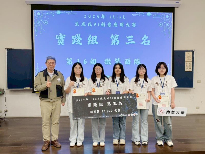 南華大學國際事務與企業學系及文化創意事業管理學系學生跨系組隊參加「2025年iLink 生成式 AI 創意應用大賽」, 以作品《生成式 AI 共創的客家八音 AR 冒險繪本》,在全國 110 組大專校院參賽隊伍中脫穎而出,榮獲實踐組第三名,展現出南華大學長期推動 AI 融入課堂教學與跨領域學習的豐碩成果。獲獎團隊於12 月 13 日於頒獎典禮上接受表揚。