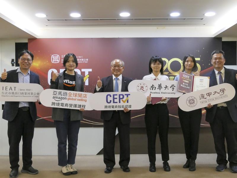 南華大學國際事務與企業學系學生在社會科學院院長暨國際系主任張心怡推薦下,於日前參加由台北市進出口商業同業公會(IEAT)主辦的「2025 CEPT 跨境電商技能認證全國競賽」,共有三位同學順利通過認證。其中,李翊禎更勇奪 CEPT–Amazon 模組個人冠軍,以優異表現為校爭光,並於9月11日出席頒獎典禮接受表揚。