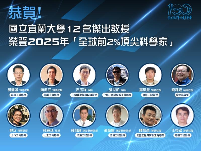 大學校園 國立宜蘭大學12名傑出教授榮登「全球前2%頂尖科學家」