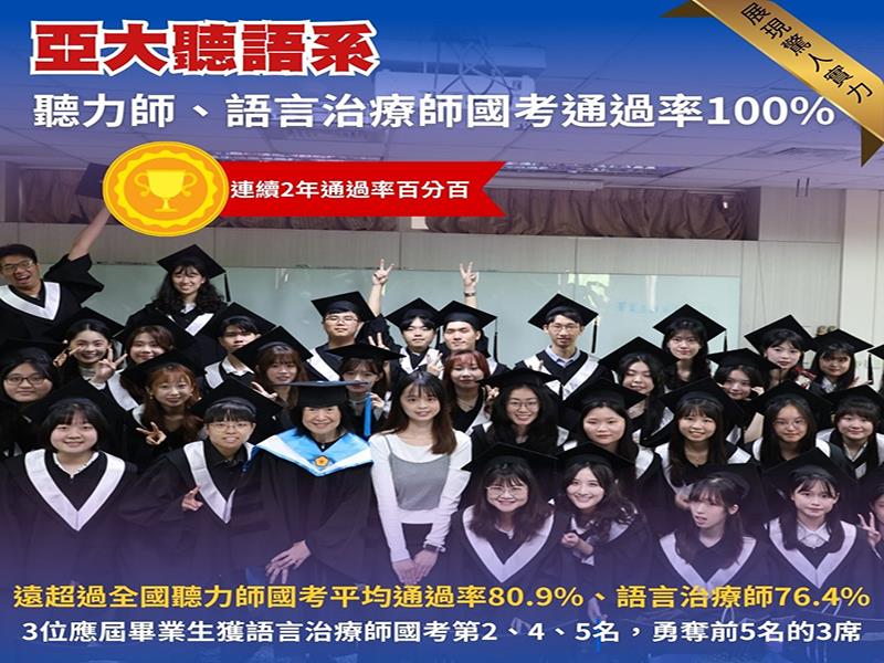 亞洲大學聽語系114年國考成績超狂:聽力師、語言治療師全數百分百過關,連續2年「滿分實力」無人能敵!更有3位應屆生直接包辦語言治療師國考第2、4、5名,勇奪前5名中的3席,霸氣展現專業實力。 畢業後更是被各大醫院、聽力公司瘋狂延攬就業率100%、起薪60K起跳,多位年薪破百萬!