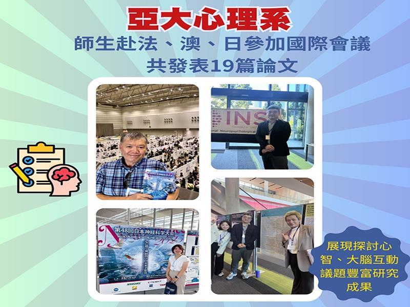 亞洲大學心理系深耕跨領域「與腦共舞的心智」、探討心智、大腦互動議題,今年暑假分別赴法國、澳洲、日本參加國際學術會議,共發表19篇研究論文,展現豐碩的研發成果。