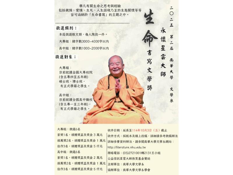 為紀念佛光山開山祖師暨南華大學創辦人星雲大師一生致力於「人間佛教」之闡揚,秉持著「以文化弘揚佛法,以教育培養人才,以慈善福利社會,以共修淨化人心」之宗旨弘法利生,提倡生命永續,主張做好事、說好話、存好心之三好運動,實踐其生命關懷。由南華大學文學系舉辦的「第二屆永懷星雲大師—生命書寫文學獎」,將藉由獎勵生命故事之創作,呼應星雲大師以文學書寫人生,自覺而覺他,實踐生命教育之崇高理念。歡迎對文學有熱情、對生命有反思的全國高中、大專院校學子們踴躍投稿,為廣招稿件,本次收件特別延長至10月3日截止。