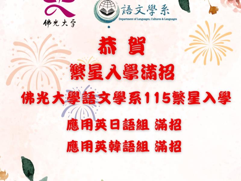 佛光大學語文學系於115學年度繁星推薦入學招生再傳佳績,應用英日語組與應用英韓語組雙雙順利滿招,展現學系辦學特色與招生成果深獲高中學生及家長肯定,也為新學年度招生寫下亮眼成績。 佛光大學表示,語文學系長期深耕外語教育,致力培養兼具語言能力、跨文化溝通素養與國際視野的人才。此次繁星推薦入學中,應用英日語組與應用英韓語組皆順利達成滿招目標,不僅反映學系課程規劃與教學品質備受肯定,也顯示學生對多元語言專業與國際職涯發展的高度關注。 語文學系近年持續強化語言應用與跨域學習,結合英語、日本語、韓語等專業課程,並搭配文化理解、國際交流、實務應用與職涯導向培育,協助學生在全球化時代中建立多語競爭力。透過完整的課程設計與多元學習資源,學生得以在語言專業之外,進一步拓展國際移動力與跨文化溝通能力。 此次招生佳績,充分展現佛光大學語文學系在外語人才培育上的穩健實力與辦學特色。全體師生對於繁星推薦入學滿招成果深感振奮,並共同分享這份喜悅,期盼未來持續吸引更多優秀學子加入佛光大學,在優質學習環境中開展多元成長與國際發展的無限可能。 佛光大學強調,未來將持續精進教學品質與課程特色,深化語言教育與國際交流能量,培育更多具備人文素養、外語實力與全球視野的優秀人才,讓佛大學子在國際舞台上自信發光。