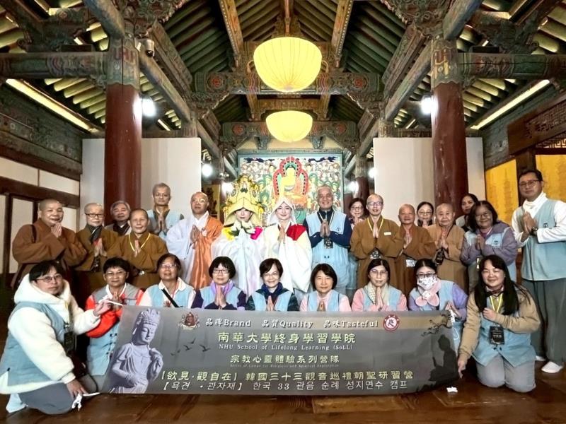 由南華大學終身學習學院精心策畫的「欲見.觀自在」韓國33觀音巡禮朝聖研習營首部曲獲得廣大迴響,二部曲也於日前辦理成功,深獲好評。此次除了延續首部曲的深度學習精神,更由校長高俊雄親自擔任總領隊,前韓國首爾佛光山寺住持暨佛光山國際佛教促進會專員依恩法師及終身學習學院院長知賢法師擔任授課講師,率領17位學員及終身學院工作團隊一行23人,展開為期8天的研習旅程。前往韓國世宗、大田、大邱、忠清南北道及慶尚北道的殊勝33觀音寺院朝聖硏習與文化交流。